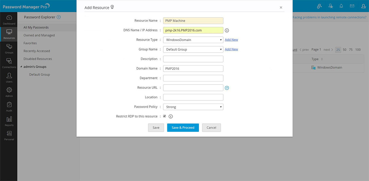 - In the pop-up form that opens, add the Domain Controller - PMP Machine, as a new resource with 'Resource Type' as Windows Domain.