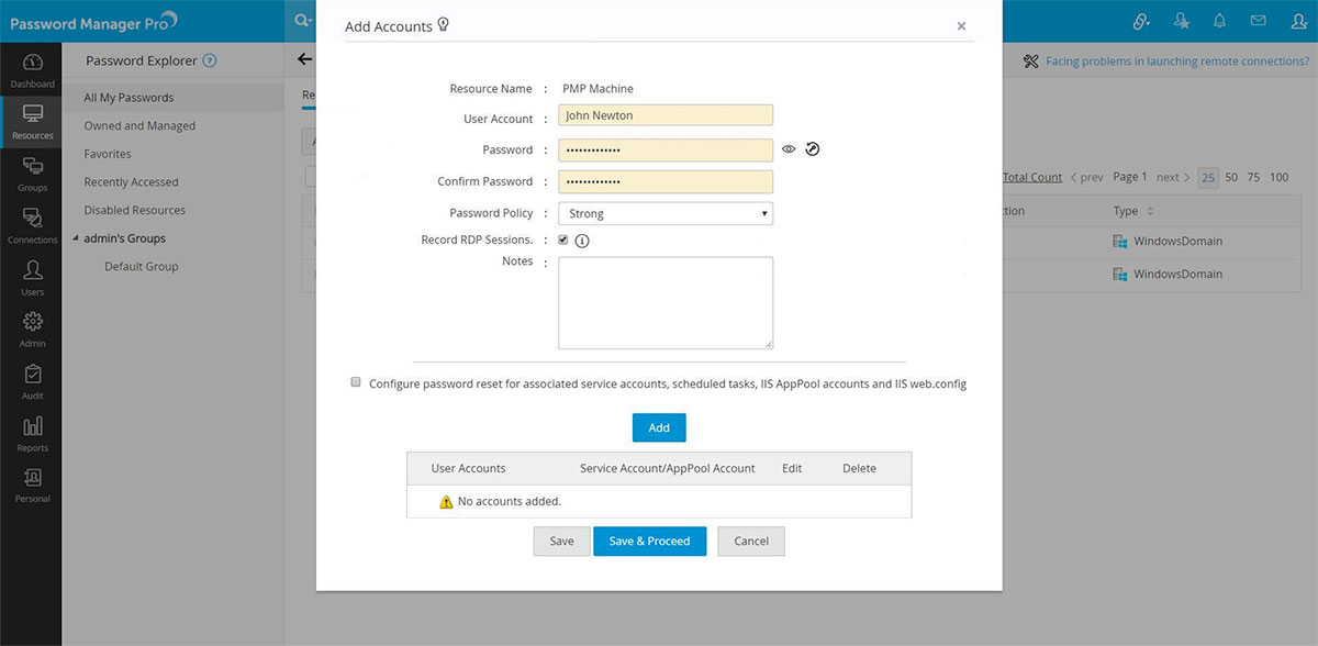 - Click "Save". Password Manager Pro will immediately reset the password in the domain first and then, automatically update the new password across all servers where 'John Newton' is used to run IIS websites.