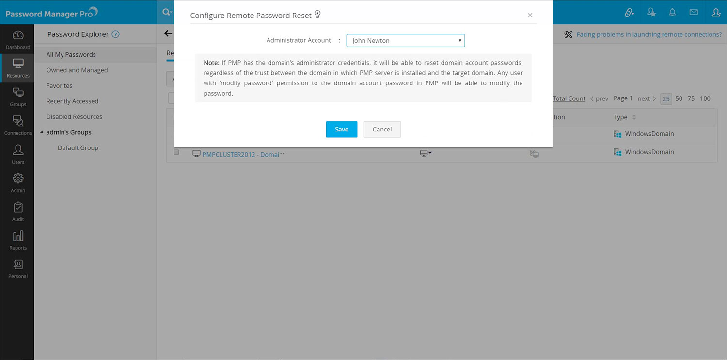 - Click the "Resource Actions" icon against the WindowsDomain 'PMP Machine' resource and select "Configure password reset" from the drop down.