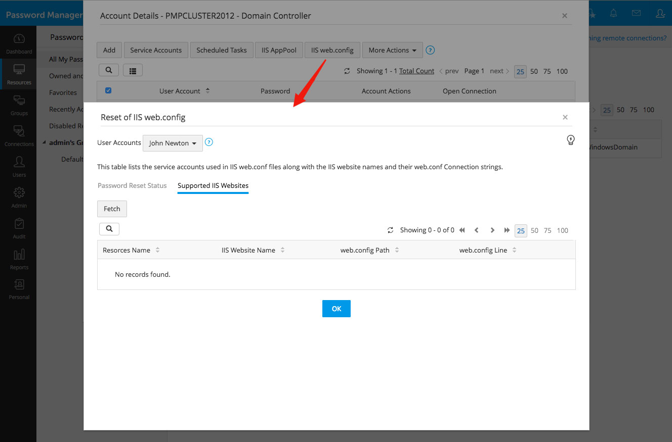 - Password Manager Pro will scan and list all the websites that are run in the servers of IIS websites in which the service account is used in the connection string of the web.conf files. After reviewing the list, hit 'OK'.