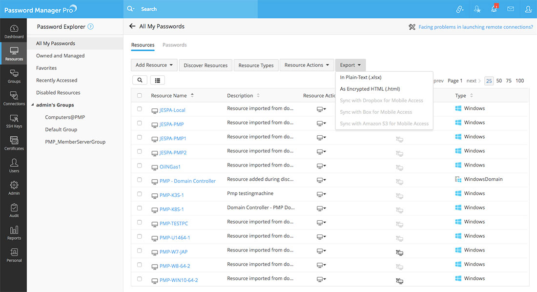 - The basic option is to export password information such as resource name, account name, and passwords in plain text to a spreadsheet.