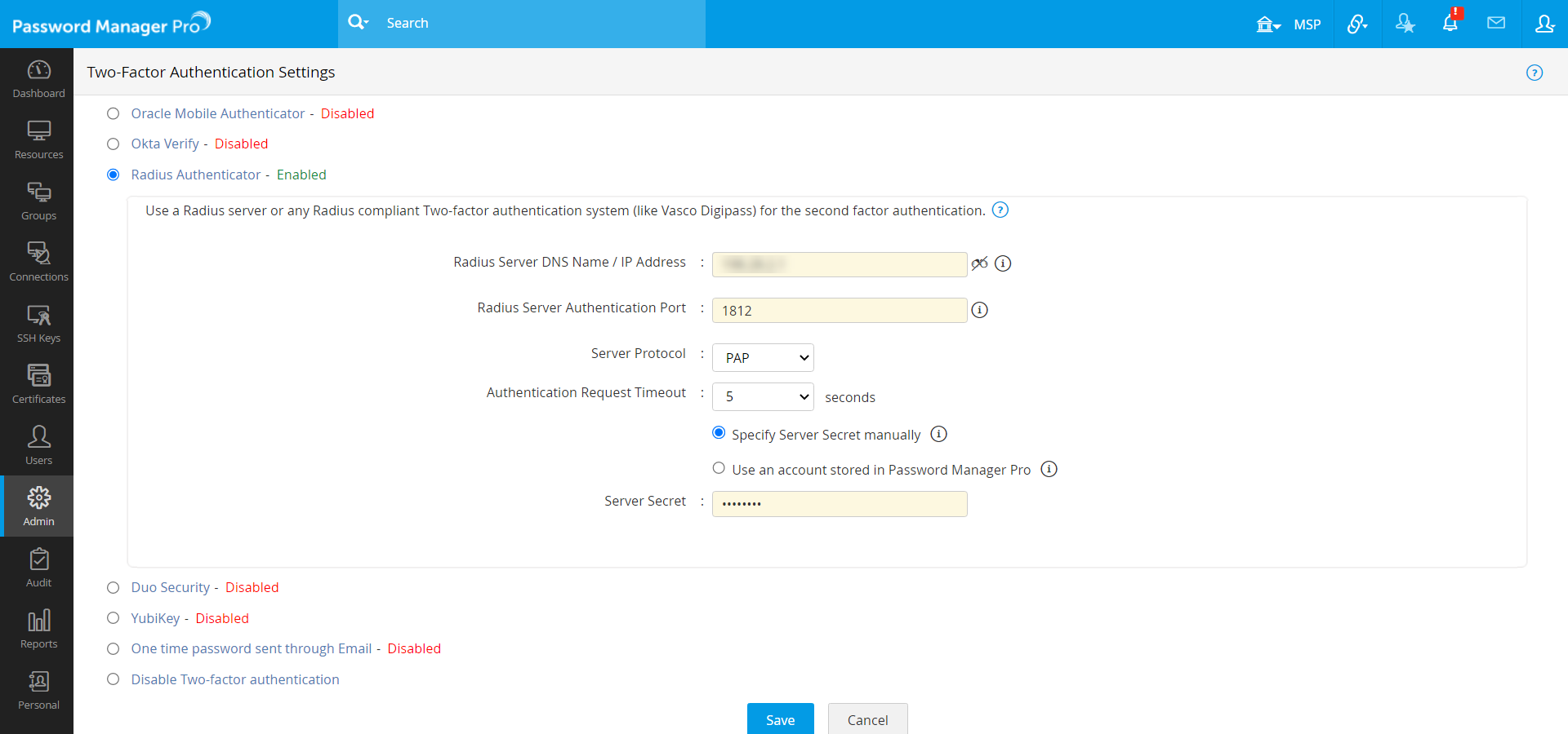 - Server Secret - You have the option to enter the RADIUS server secret either manually in the text box or you can direct Password Manager Pro to use the secret already stored in the product. In that case, you need to select the resource name and account name from the drop-down. The second option - storing the RADIUS password in Password Manager Pro and selecting it from drop-down is the recommended approach.