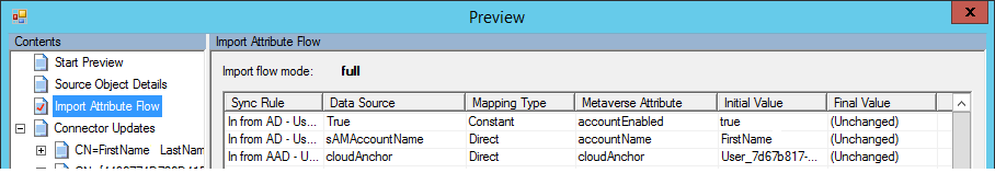 - Similar to above, you can view the Azure Active Directory Connector Space object and can generate the Preview to view the attribute flow from Metaverse to the Connector Space and vice versa. This can help you identify why an attribute is not syncing.