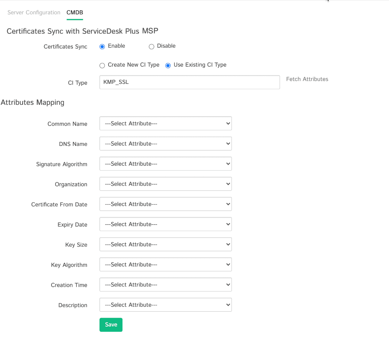 • Navigate to the CMDB tab, select Enable for Certificates Sync and choose and configure the CI Type.