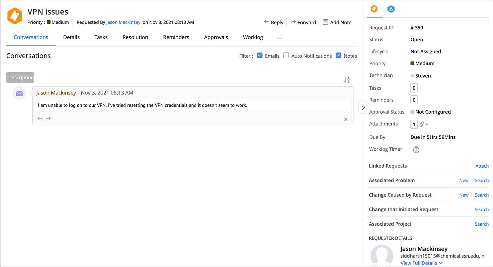 Once assigned, the technician works to resolve the ticket within the specified SLA mandate. If required, they may escalate the ticket to a specialist support group for resolution. The technician contacts the employee from within the ticketing system and requests for more information on the issue.