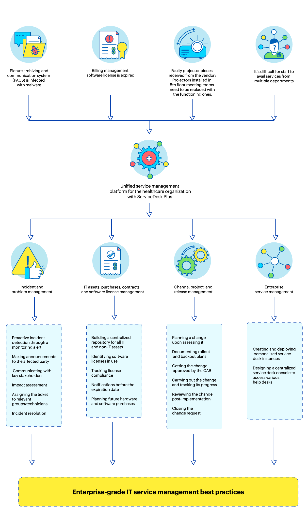 Following the pandemic, the IT service desk team grew more important than ever. New equipment and facilities were introduced like machines with enhanced AI and ML capabilities, IoT devices, additional servers, and more to speed up processes, and major system upgrades were carried out to ease the strain on servers resulting from the increase in patient information as COVID-19 cases increased exponentially. Virtual care, virtual hospitals, and remote work were also introduced and quickly implemented in several healthcare organizations. To ensure service continuity, healthcare organizations needed an effective IT and business service management platform that supports their mission-critical processes and helps deliver enterprise-grade services to their employees.