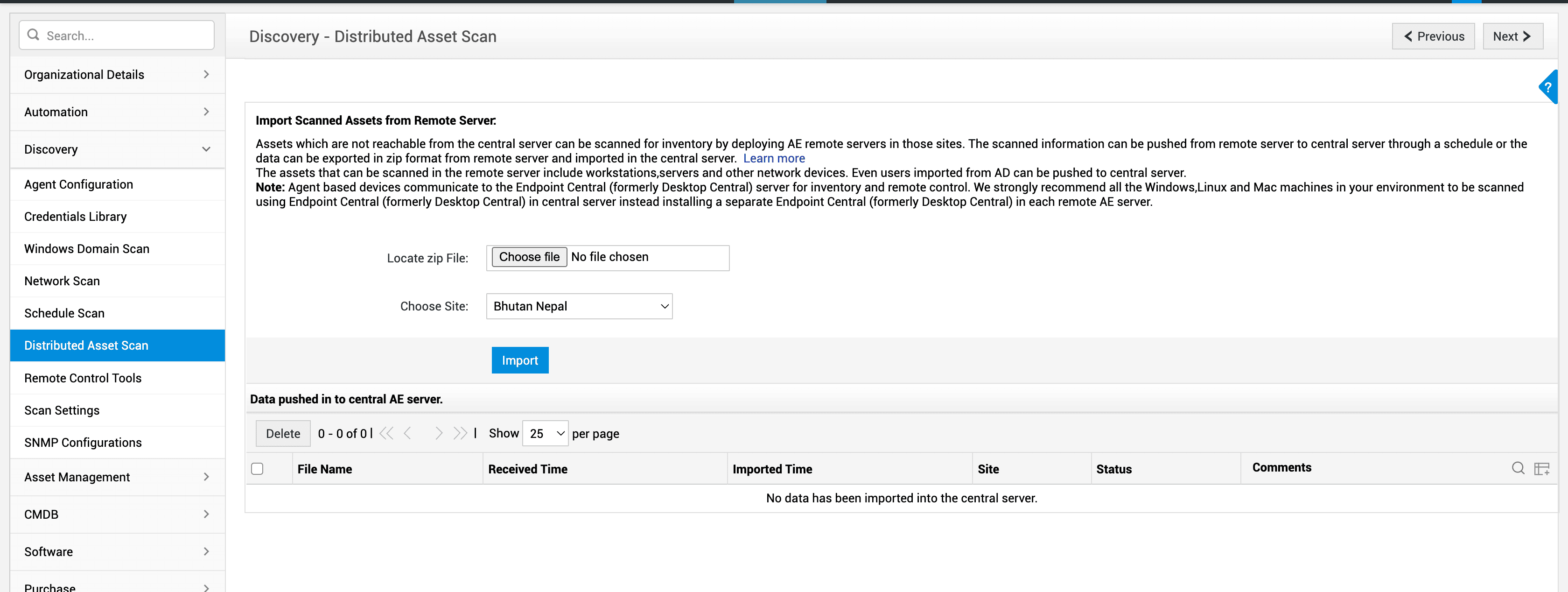 Distributed asset scan capabilities: The on-premises version of ServiceDesk Plus offers distributed asset scan capabilities (Fig. 7), enabling organizations to scan and monitor assets across multiple locations and environments. At each site, a remote server is deployed to scan and manage workstations and user information within its designated location. The data collected by the remote server is then transmitted to the central server, either through manual initiation or by scheduling periodic data transfers.
