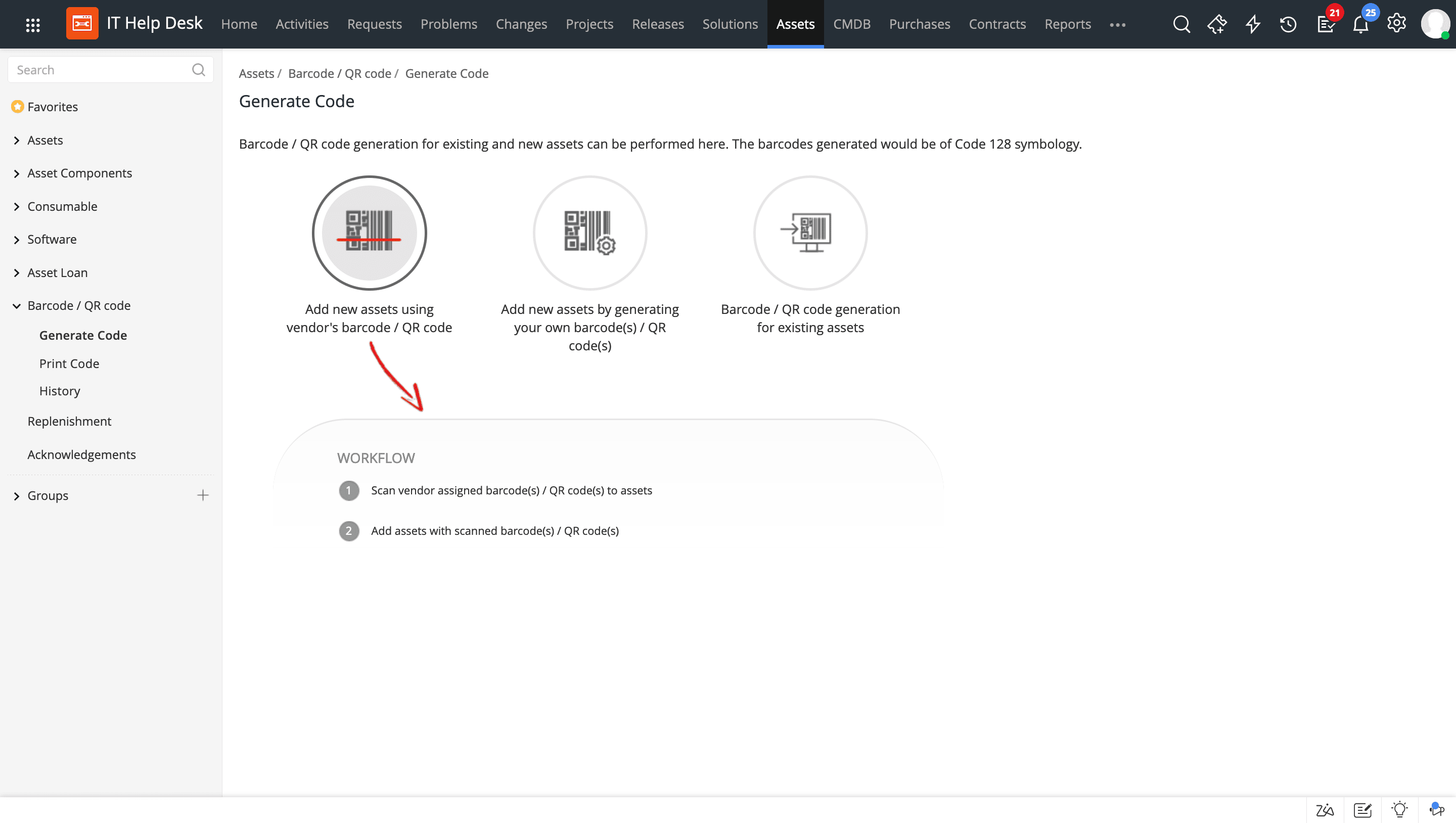 Barcode or QR code scan: Barcodes or QR codes (Fig. 5) serve as a 2D identification method used to store asset information in ServiceDesk Plus. Upon adding assets to the organization, unique barcodes or QR codes can be generated and linked to each asset. Alternatively, you can scan an asset's barcode or QR code, whether provided by the vendor or generated manually, to include it in the organization. Once a code is associated with an asset, scanning it enables the immediate retrieval of the relevant asset information.
