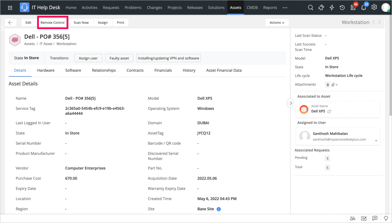 To troubleshoot remote IT assets effectively, ServiceDesk Plus integrates with Endpoint Central, providing the capability to remotely access assets directly from the ticket console (Fig. 15). Through the ticket console, technicians can initiate remote access to troubleshoot issues on distributed assets without the need for a physical presence. This enhances efficiency in resolving issues and ensuring prompt support to users. Using these features, Zylker was able to effectively manage its IT landscape, consisting of both remote and on-premises assets.