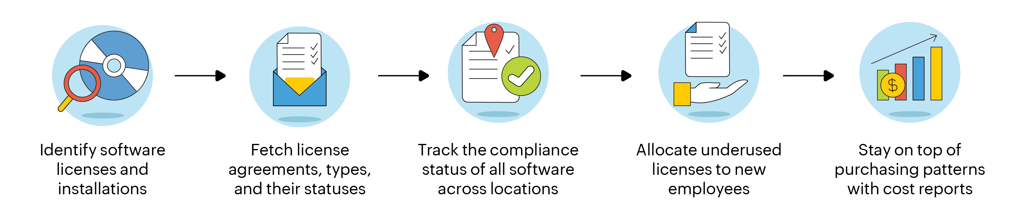Tracking and organizing software assets without a well-defined strategy to mitigate security risks and ensure license compliance leaves software license management incomplete. Three primary concerns that emerge during the software audits for Zylker include: