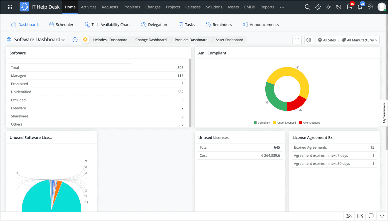 The Software Dashboard (Fig. 20) within ServiceDesk Plus offers a comprehensive summary of the overall count of software and licenses. It presents pertinent information about managed, prohibited, and unidentified software and rarely used licenses. Furthermore, it provides real-time updates on expired license agreements and those nearing expiration. The dashboard showcases charts that visually represent compliance status and software usage details, allowing you to strategically plan your actions based on this information.