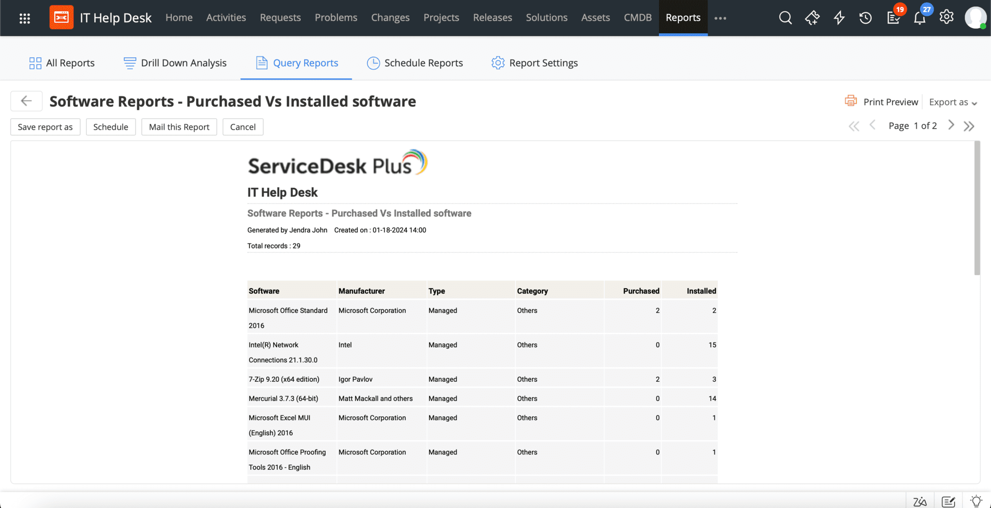ServiceDesk Plus offers numerous reports to assist in budget optimization. These reports cover aspects like purchased versus installed software (Fig. 22), aiding in strategic decision-making. For more specific details, you can create custom query reports, ensuring precise insights from the ServiceDesk Plus data.