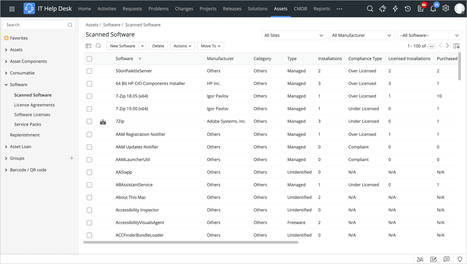 ServiceDesk Plus' multi-modal asset discovery methods not only scan and retrieve hardware details but also capture software information. This data can then be complemented with additional details such as license type, compliance status, and the correlation between purchases and installations (Fig. 17).