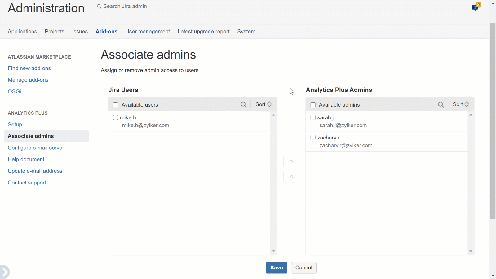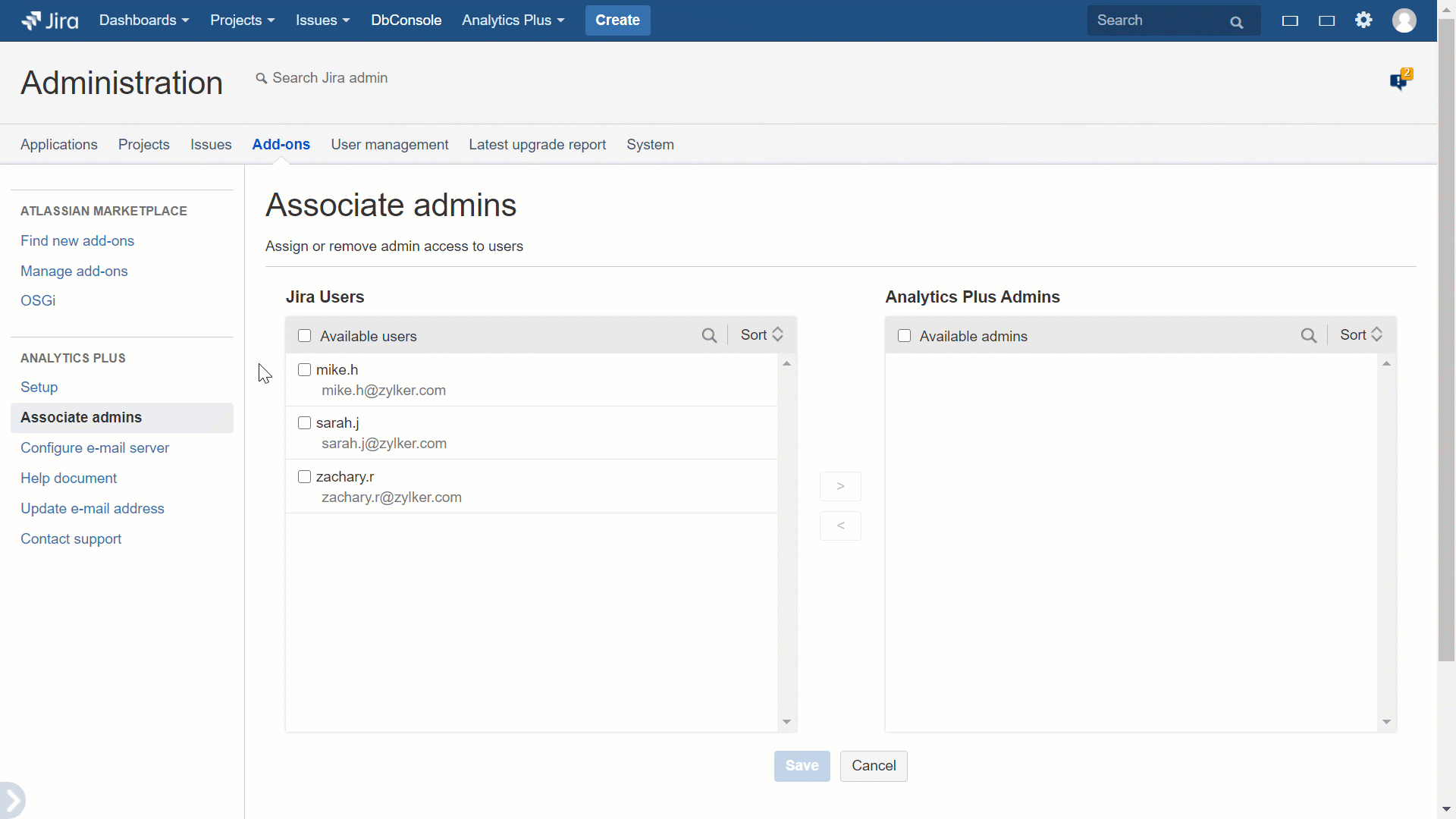 After making your selection in the Jira Users list, click the > button to provide admin permissions to the selected users, and click Save.