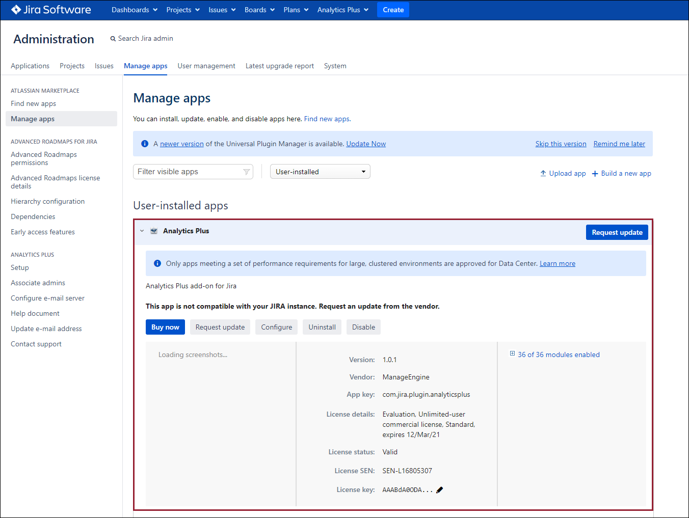 You can view details of your Analytics Plus subscription from the Manage apps page in your Jira Software application. To access this page, click the Settings icon and select the Manage apps option.