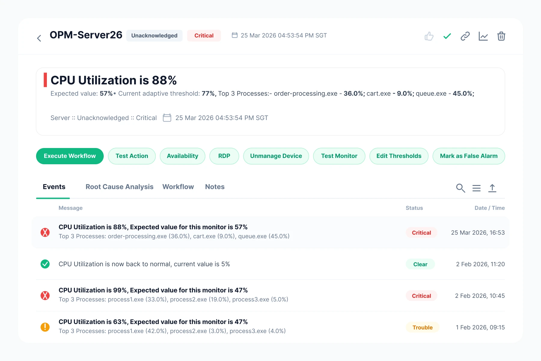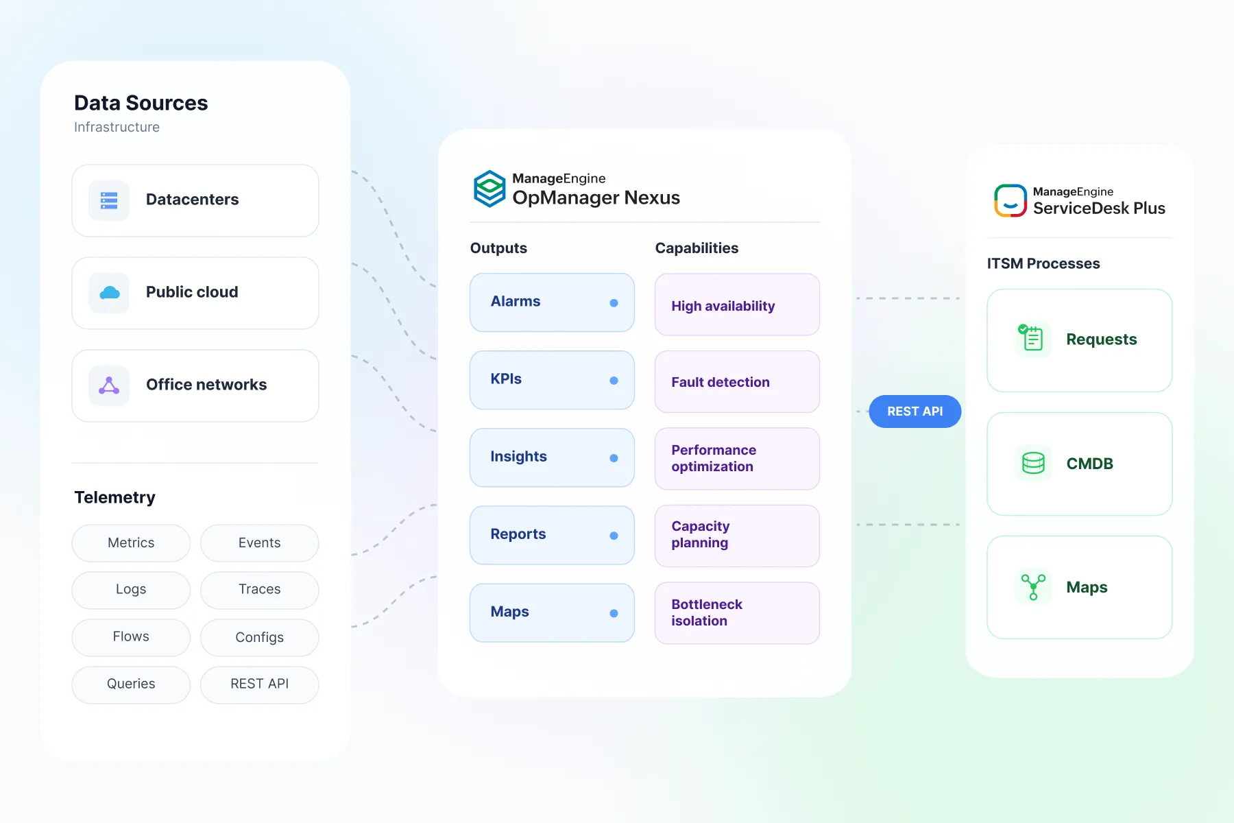 Seamlessly connect full stack observability with IT service management through the integration of OpManager Nexus and ServiceDesk Plus. Maintain accurate CMDB records with automated discovery and streamline incident response by enriching helpdesk tickets with context rich, AI driven performance alerts.