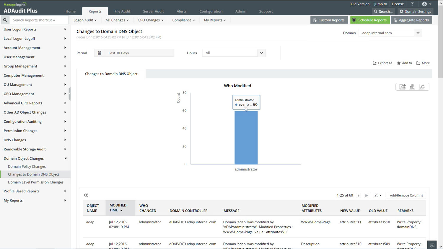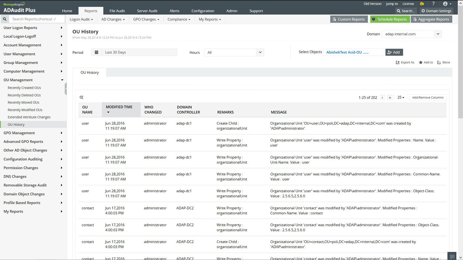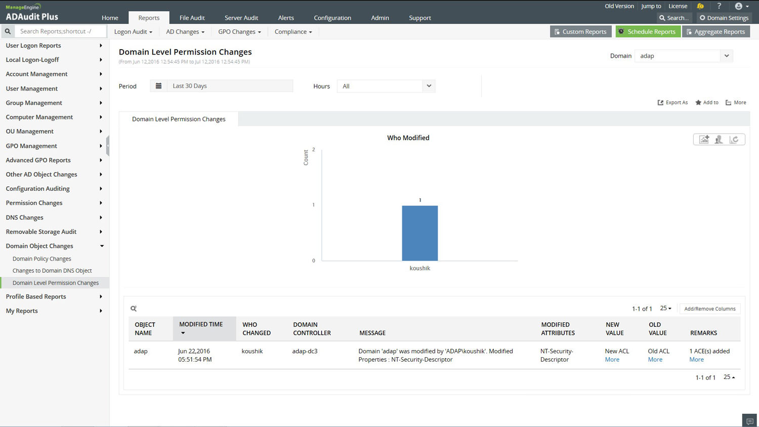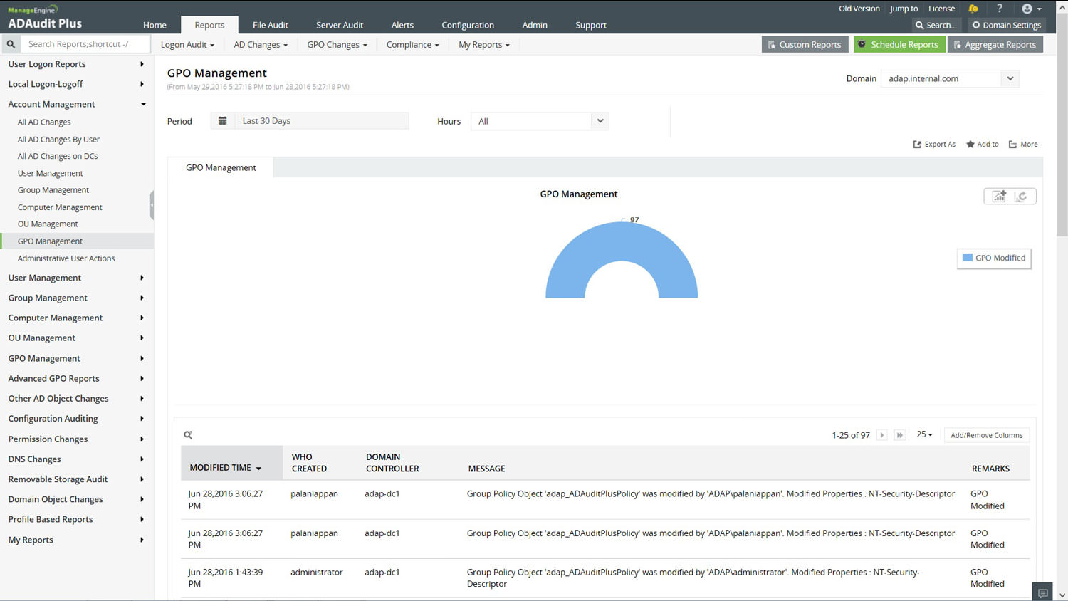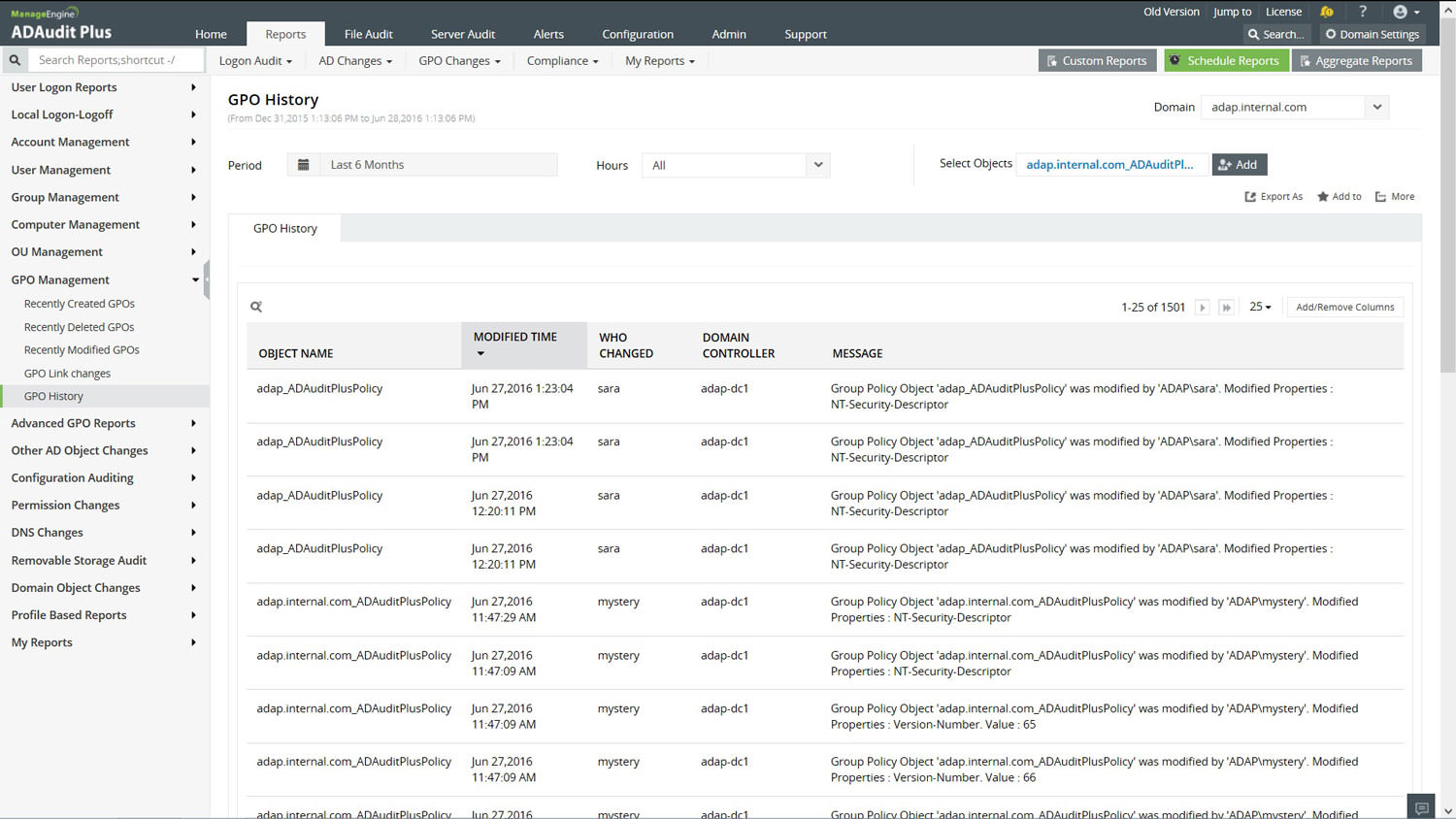 Monitora e segnala ogni modifica apportata a una moltitudine di oggetti AD, tra cui utenti, gruppi, unità organizzative, computer, oggetti Criteri di gruppo, siti, ruoli FSMO e altro ancora.