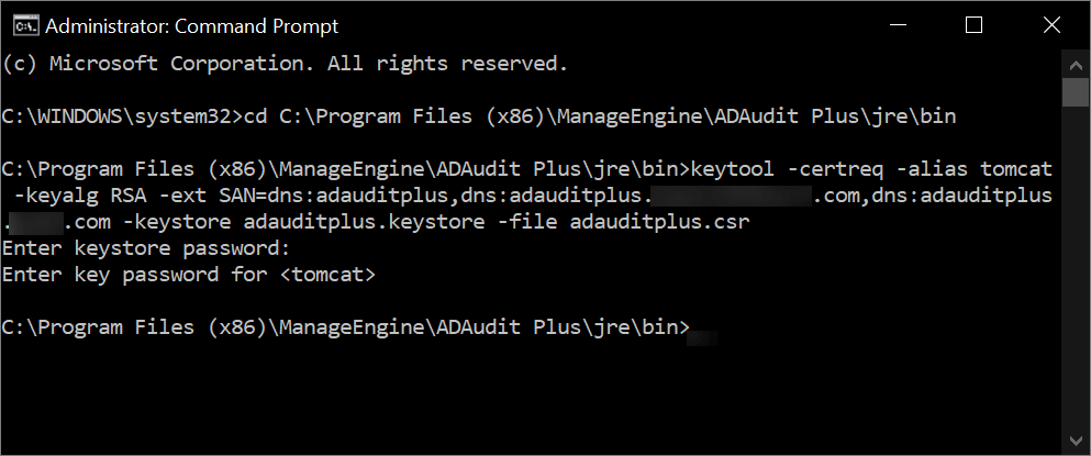 keytool -certreq -alias tomcat -keyalg RSA -ext SAN=dns:server_name,dns:server_name.domain.com,dns:server_name.domain1.com -keystore <domainName>.keystore -file <domainName>.csr