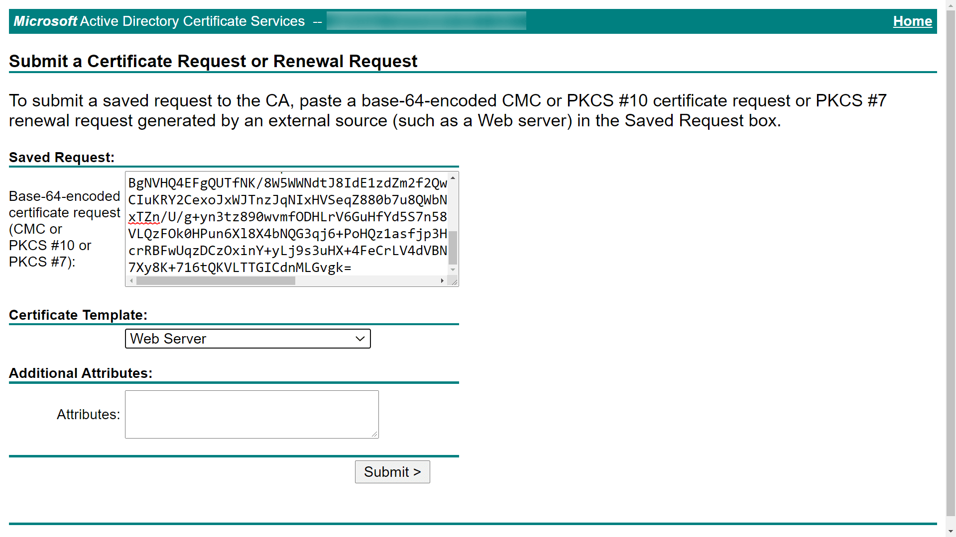- Nella pagina Invia una richiesta di certificato o una richiesta di rinnovo, copia il contenuto dal file CSR e incollalo nel campo Richiesta salvata.