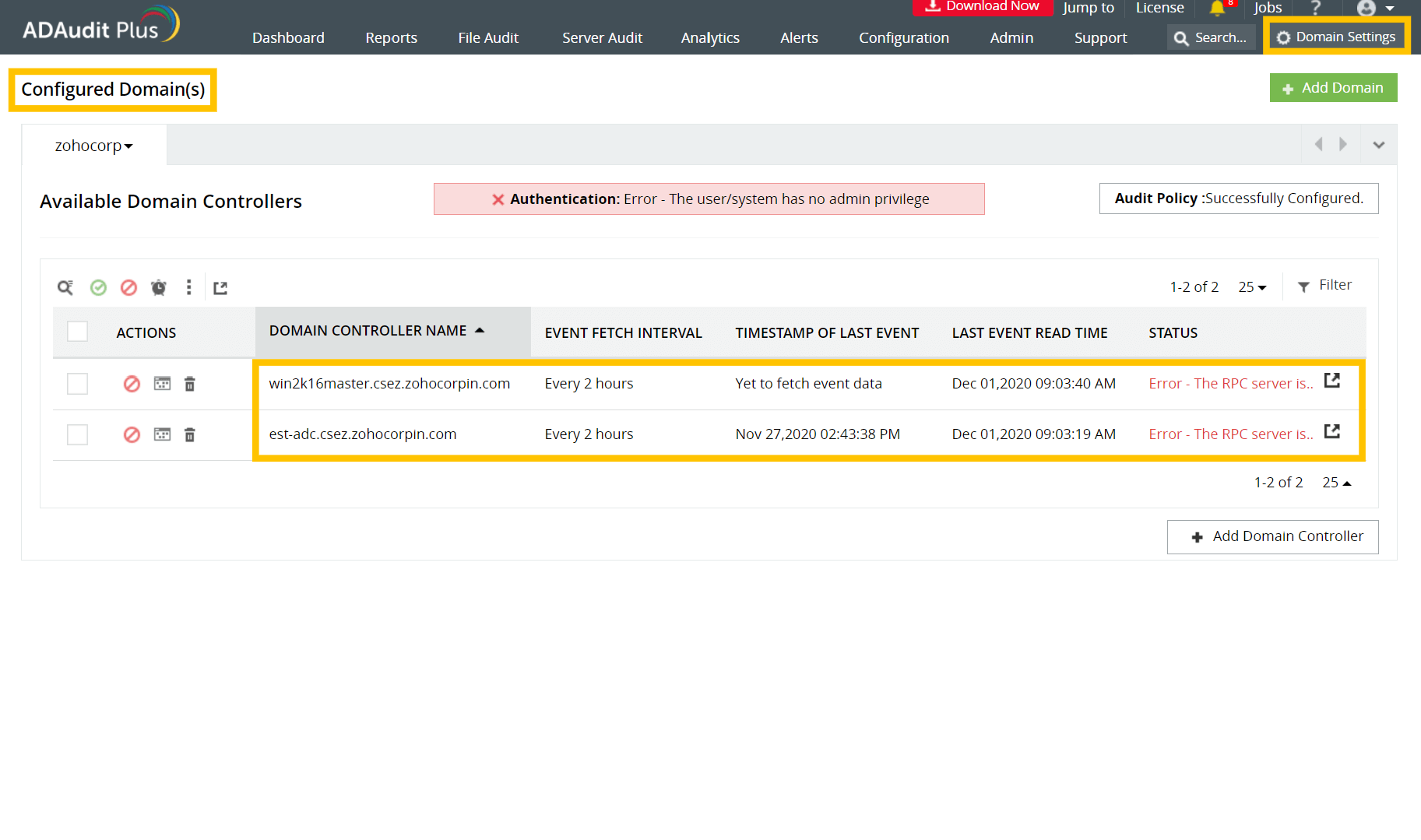 - Identifica il server che mostra l'errore RPC dal file Available Domain Controllers in Domain Settings o in Configured Server(s) nella scheda File Audit o in Configured server(s) nella scheda Server Audit.