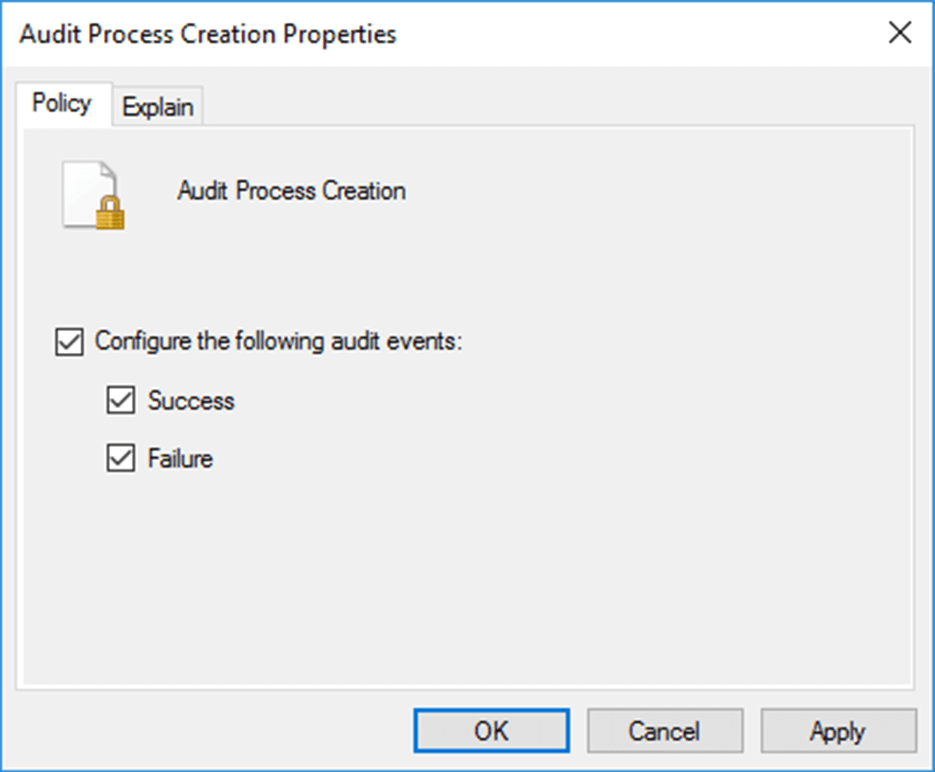 - Nel riquadro di destra, vedrai un elenco di criteri che si trovano in Analisi dettagliata. Clicca due volte su Controlla Creazione di processi e seleziona le caselle Configura gli eventi di controllo seguenti, Operazione riuscita ed Errore. Esegui le stesse azioni per Controlla Chiusura di processi.