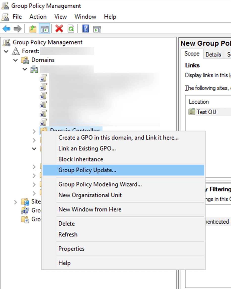 - Torna alla Console Gestione Criteri di gruppo e, nel riquadro di sinistra, clicca con il pulsante destro del mouse sull'unità organizzativa a cui è stato collegato l'oggetto Criteri di gruppo, quindi clicca su Aggiornamento criteri di gruppo. Questo passaggio assicura che le nuove impostazioni dei Criteri di gruppo vengano applicate immediatamente, anziché attendere il successivo aggiornamento pianificato.