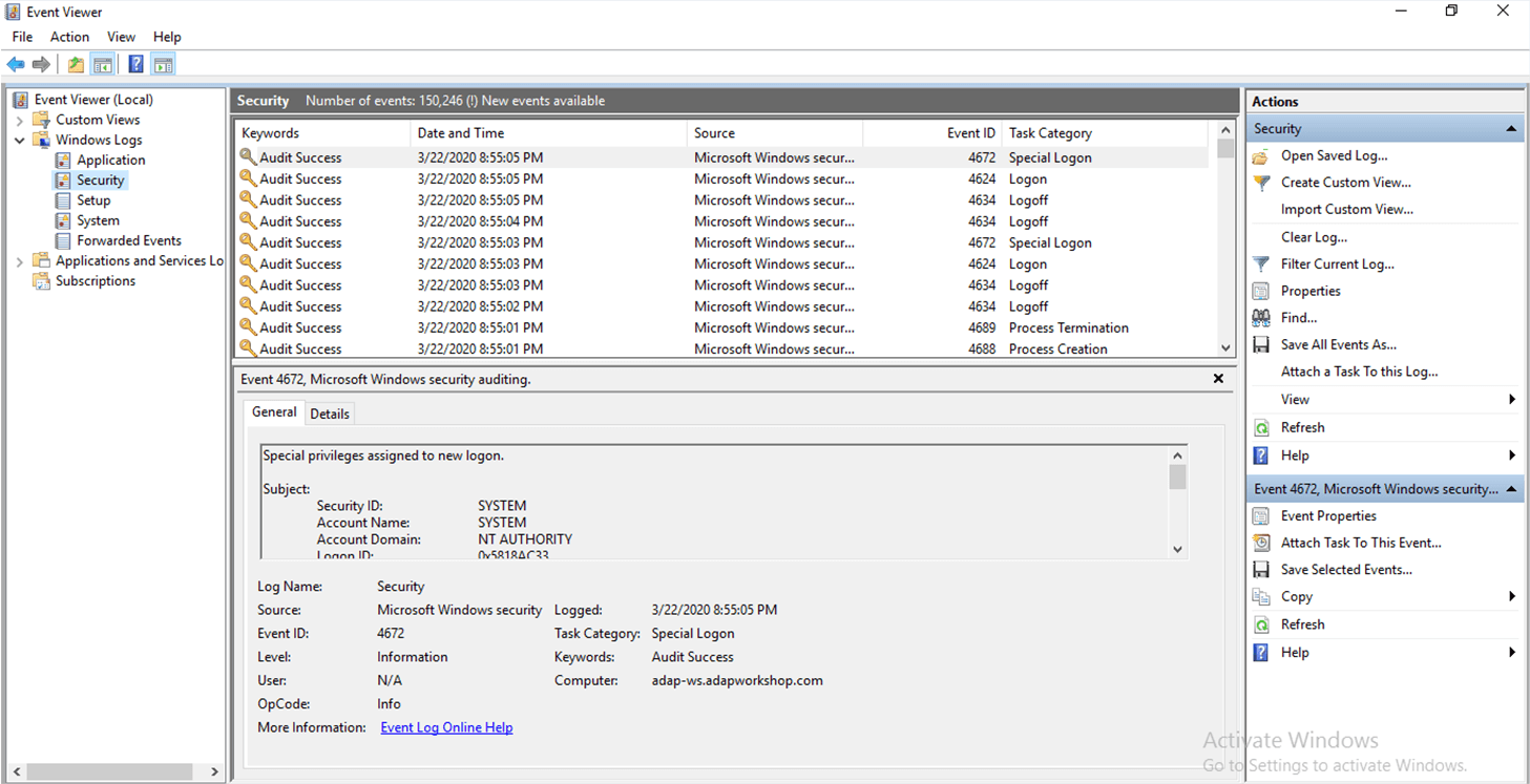 - Nel riquadro sinistro della finestra del Visualizzatore eventi, vai a Registri di Windows → Sicurezza.
