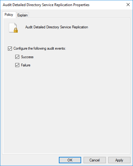 Clicca due volte su ciascuno dei criteri di controllo e seleziona le caselle Configura gli eventi di controllo seguenti, Operazione riuscita ed Errore.