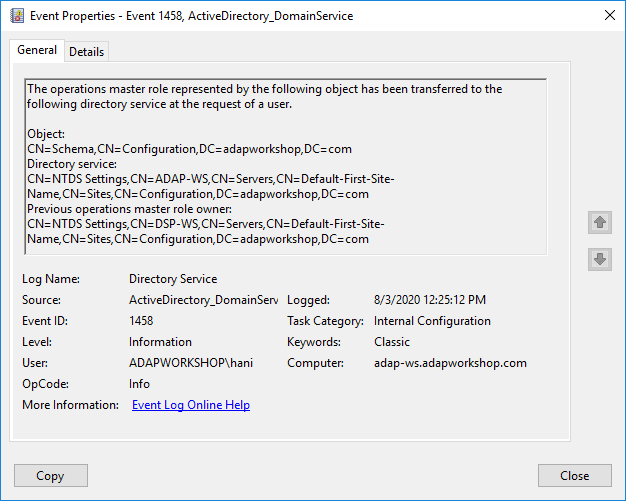Visualizza chi ha modificato il ruolo, quando e su quale controller di dominio è stata eseguita l'azione, insieme ai dettagli sui valori vecchi e nuovi.