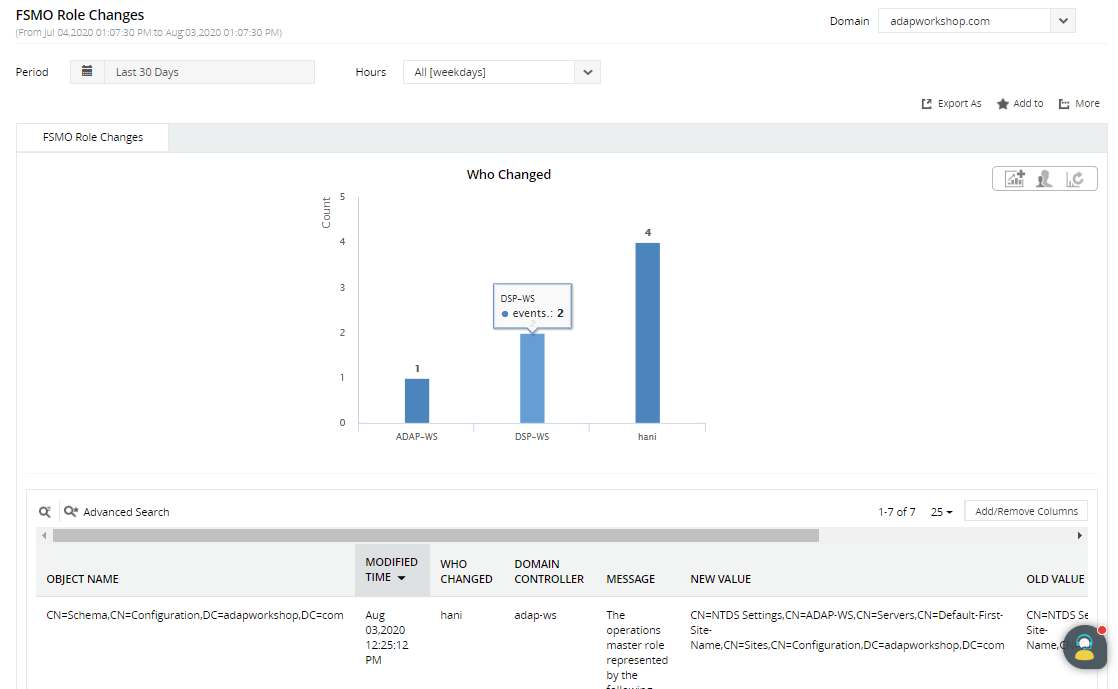 ADAudit Plus è una soluzione di controllo delle modifiche AD in tempo reale che viene fornita con report predefiniti per tutte le modifiche di AD, incluse le modifiche ai ruoli FSMO.