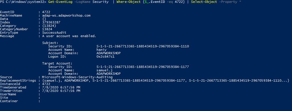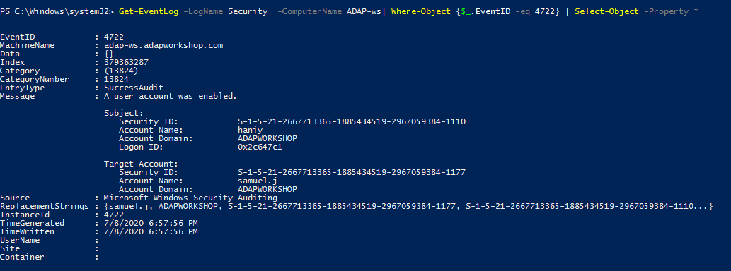 Get-EventLog -LogName Security -ComputerName <DC name>| Where-Object {$_.EventID -eq 4722} | Select-Object -Property *