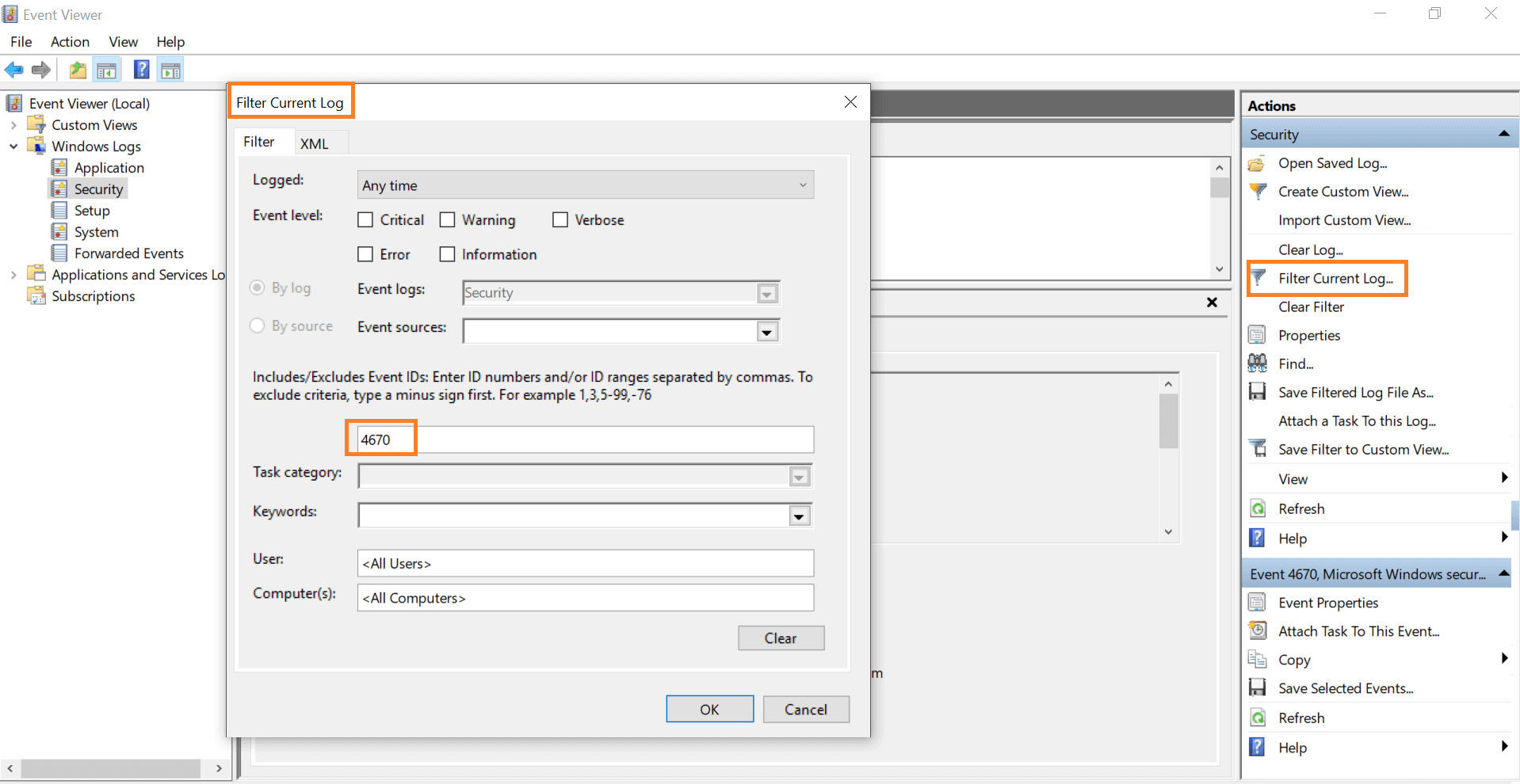 Per filtrare i registri eventi in modo da visualizzare solo quelli relativi alle modifiche alle autorizzazioni di file/cartelle, seleziona "Filtra registro corrente" nel riquadro di destra. Ti sarà sufficiente cercare l'ID evento 4670 che indica le modifiche alle autorizzazioni di file/cartelle.