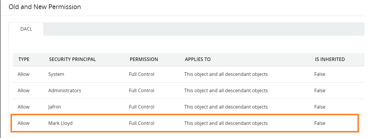 Per ulteriori informazioni sull'autorizzazione esatta che è stata modificata, puoi esaminare il descrittore di sicurezza precedente e quello nuovo.