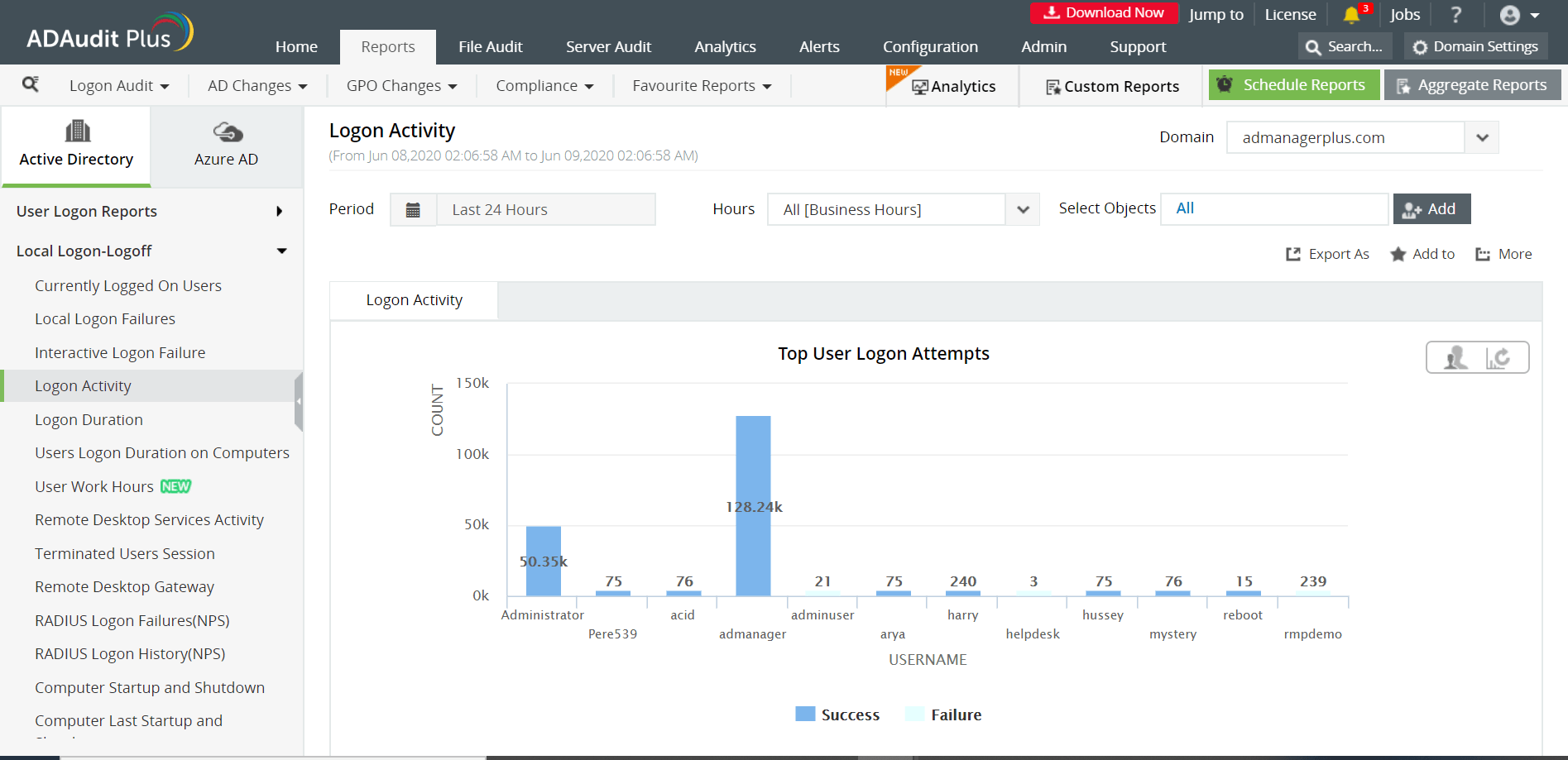 ADAudit Plus è una soluzione di controllo Active Directory completa che ti aiuterà a monitorare e verificare gli accessi e le disconnessioni locali da parte degli utenti del dominio. Può anche tenere traccia di altri eventi critici che possono causare interruzioni della rete.