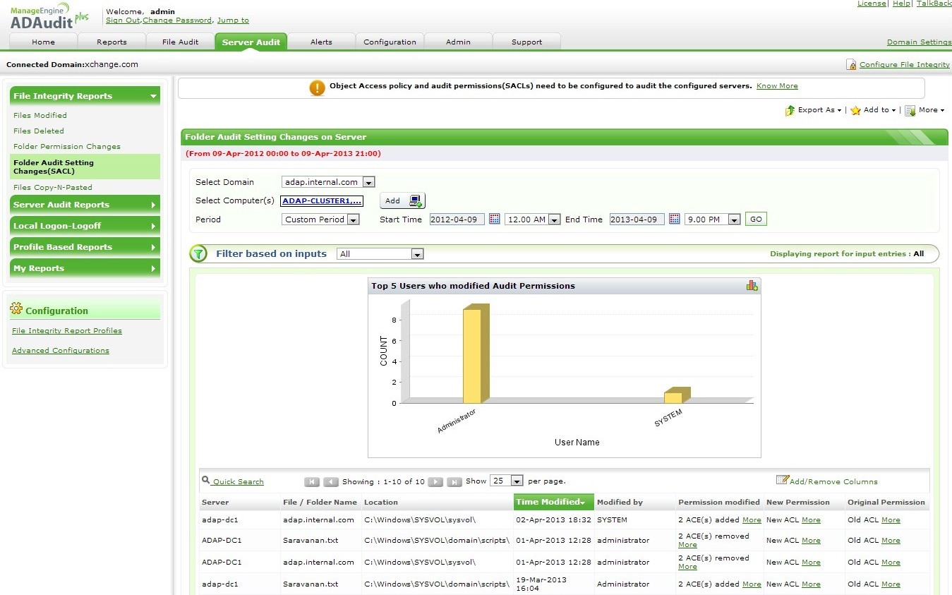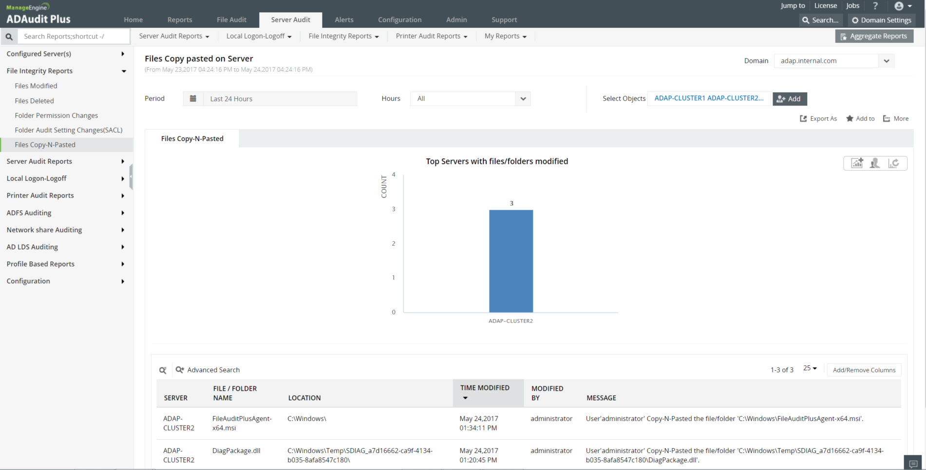 I file e le cartelle di sistema, configurazione e programmi vengono monitorati costantemente da ADAudit Plus e appena viene rilevato un cambiamento, vengono inviati avvisi istantanei via email con un riepilogo degli eventi dettagliato per agire immediatamente. Generalmente, quando un sistema viene compromesso, l'attaccante di solito altera certi file chiave per ottenere l'accesso e prevenire il rilevamento. Sapere Chi ha fatto Quale modifica da Dove e Quando con ADAudit Plus.