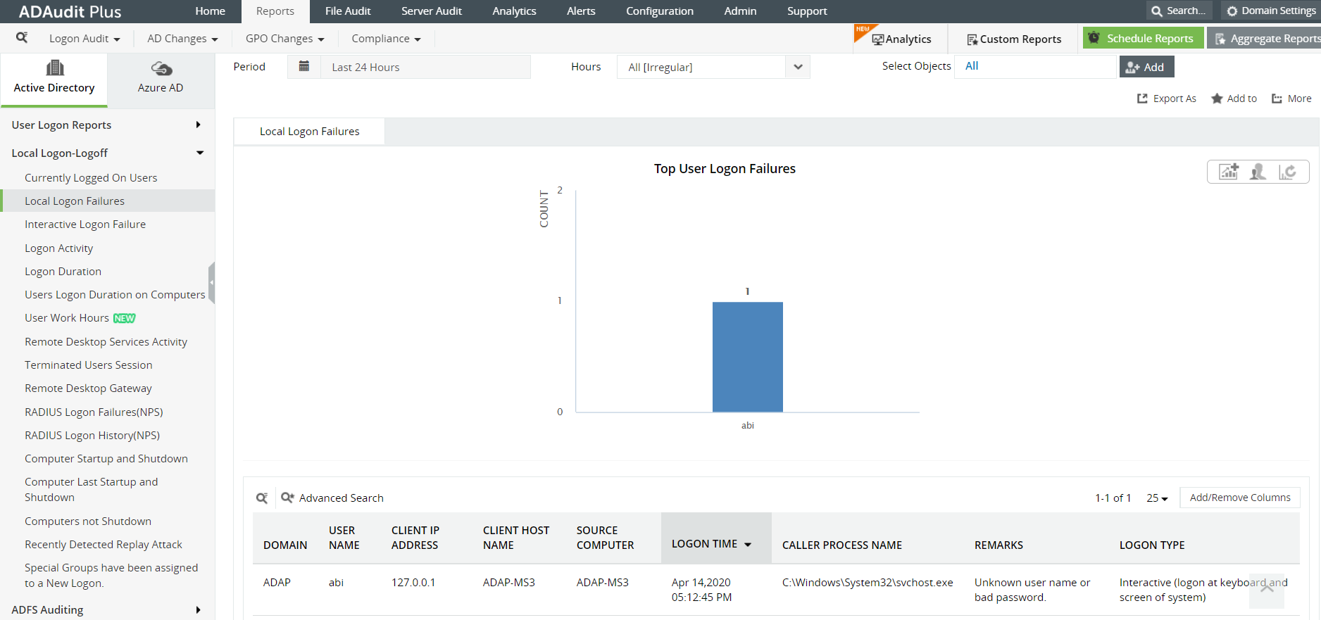 - I registri di protezione comprendono numerosi eventi come le modifiche a file o oggetti AD, i tentativi di accesso o disconnessione non riusciti e le variazioni delle autorizzazioni. Accedere alla console web di ADAudit Plus usando le credenziali di amministratore.