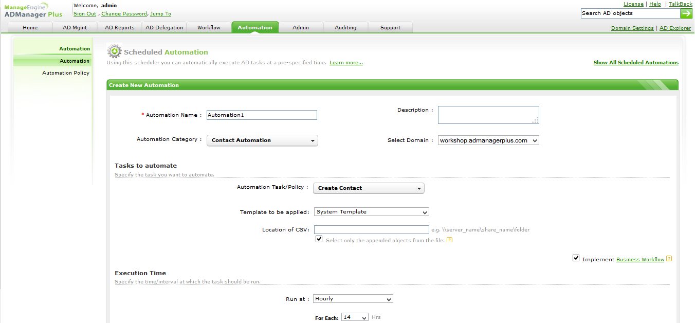 Come strumento di automazione, ADManager Plus offre possibilità di automazione per la creazione e l'eliminazione dei contatti, come mostrato in figura 4. Entra nella posizione della rete del file CSV che contiene i dettagli dei contatti che devono essere creati o eliminati. Seleziona l'intervallo di tempo per specificare quando deve essere effettuata l'attività automatizzata. Puoi pianificare l'automazione ogni ora, settimana, mese o una volta sola.