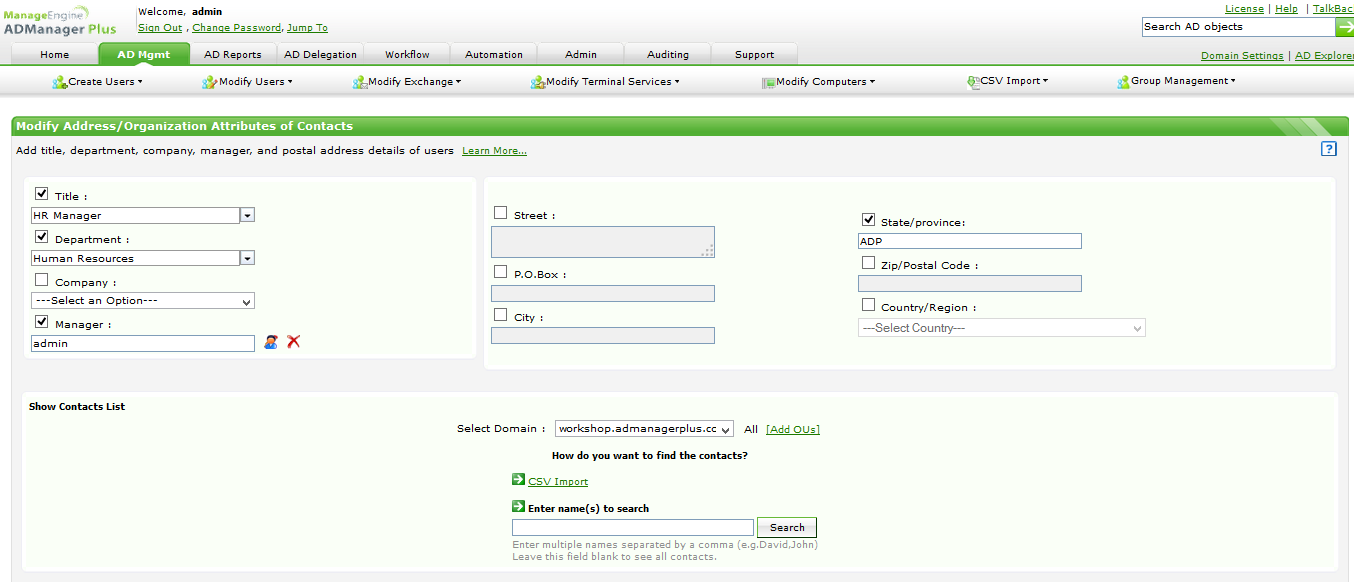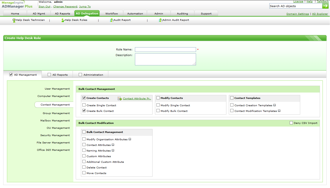 ADManager Plus ti permette di delegare la creazione e la modifica dei contatti ai non amministratori, tra cui i tecnici del servizio di assistenza e il personale HR (figura 5). Puoi indicare le unità organizzative (UO) in cui i delegati possono effettuare le loro attività assegnate. Puoi permettere ai tuoi delegati di gestire i contatti singolarmente o in blocco mediante l'opzione di importazione da CSV. Puoi anche indicare a quali contributi i delegati possono assegnare i valori.
