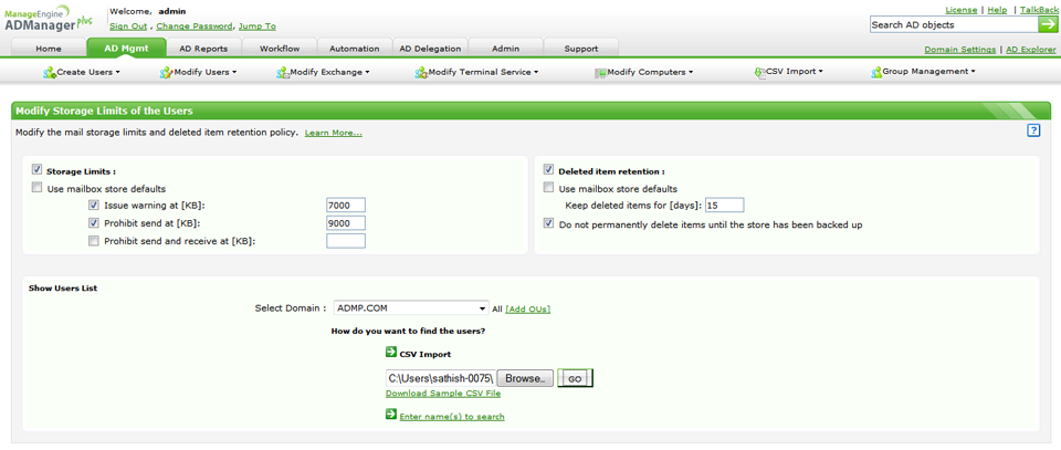 ADManager Plus trasforma la modifica in blocco degli utenti in un'attività semplice e rapida, che è l'opposto rispetto all'utilizzo di opzioni di routine come gli strumenti nativi di Active Directory, PowerShell, ecc. In funzione delle esigenze, puoi utilizzare una delle seguenti opzioni di questo software di reportistica e di gestione via web di Active Directory per modificare gli account utente: