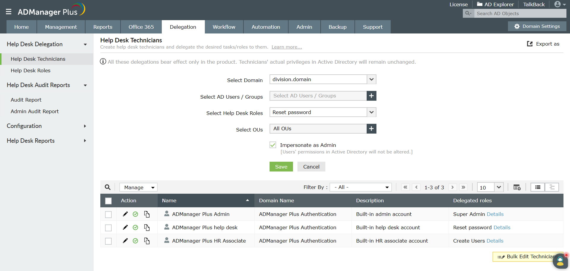 Una soluzione che va a vantaggio di entrambe le parti è la delega della reimpostazione delle password in Active Directory a un tecnico del servizio di assistenza. ADManager Plus consente di: