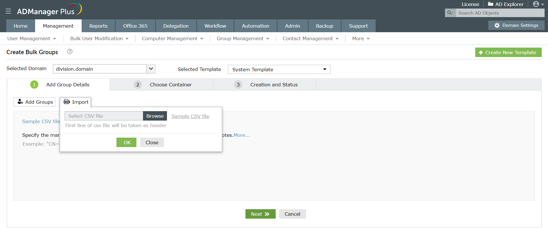 Per modificare in blocco i gruppi, crea un file CSV che contenga i nomi dei gruppi di distribuzione e i nuovi valori per tutti gli attributi da modificare. Importa il file in ADManager Plus per aggiornare gli attributi ai nuovi valori indicati nel file.