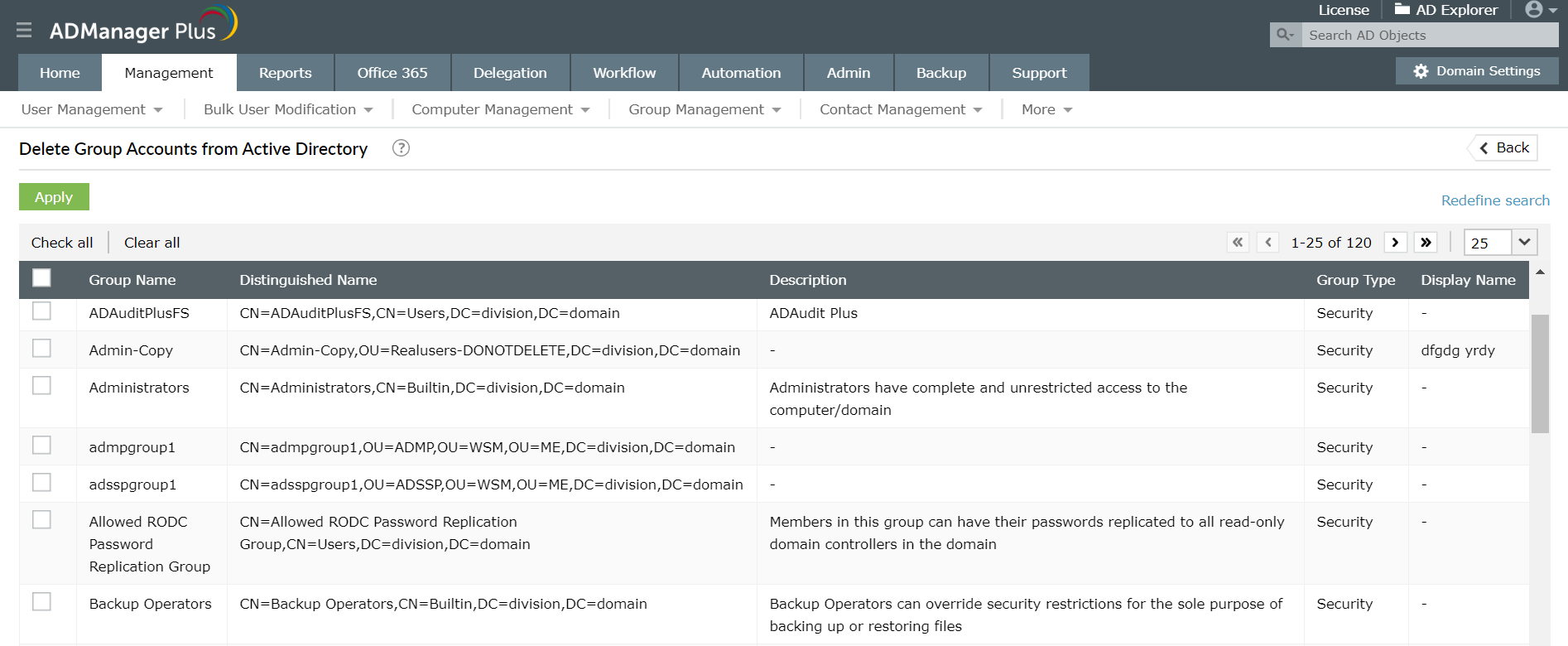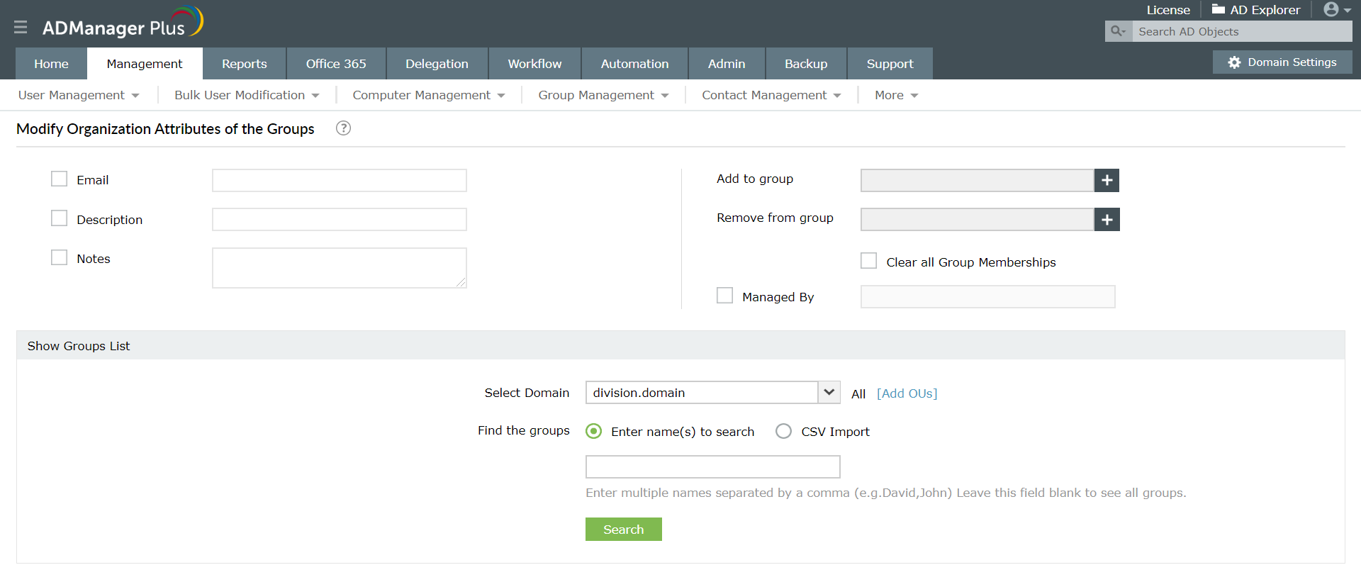 Utilizzando questa opzione, puoi modificare gli attributi dell'organizzazione dei gruppi di distribuzione come e-mail, descrizione del gruppo, appartenenza e gestore. Puoi anche aggiungere o rimuovere i membri dei gruppi e cancellare le loro appartenenze ai gruppi. L'aspetto essenziale è la capacità di applicare modifiche a questi attributi per più gruppi con una singola azione.
