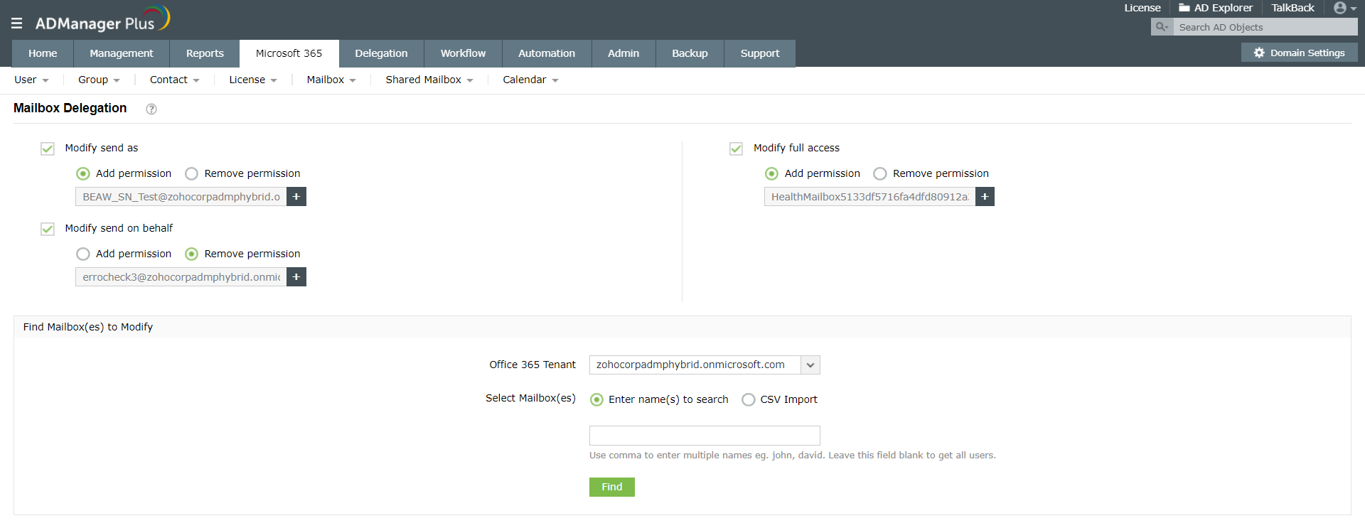 Utilizzare Exchange Admin Center o PowerShell per applicare diverse autorizzazioni a diversi utenti o gruppi può essere complicato. ADManager Plus ti aiuta a superare queste difficoltà mediante la delega delle autorizzazioni agli utenti e i gruppi di sicurezza abilitati per posta elettronica per gestire in blocco le cassette postali di Exchange Online.