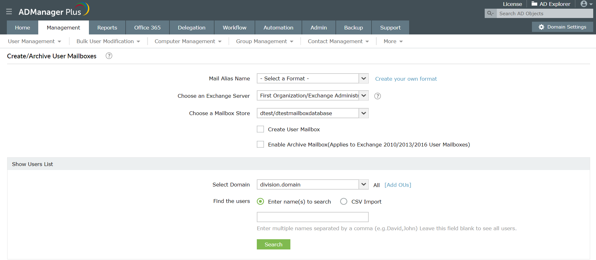 Diversamente dagli strumenti Exchange nativi, ADManager Plus, il software di gestione via web di Exchange Server ti consente di gestire le cassette postali di Exchange con semplici azioni di clic senza script. Ti offre inoltre funzionalità predefinite per attività comuni di Exchange per aiutarti a gestire le cassette postali di Exchange con facilità e rapidità sulle versioni di Exchange Server 2003, 2007, 2010, 2013 e 2016.