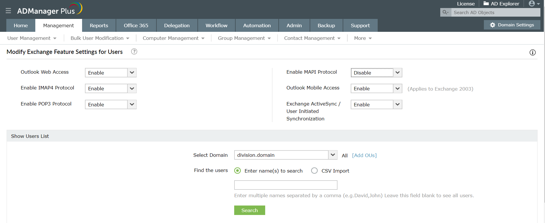 Disabilita le cassette postali di Exchange: Diversamente dagli strumenti di gestione convenzionali/nativi di Exchange, ADManager Plus ti permette di disabilitare in blocco diverse cassette postali di Exchange con pochi semplici clic. Per rendere questa attività ancora più semplice, questo strumento offre un'opzione di importazione da CSV che ti permette di recuperare l'elenco degli utenti le cui cassette postali devono essere disabilitate da un file CSV.