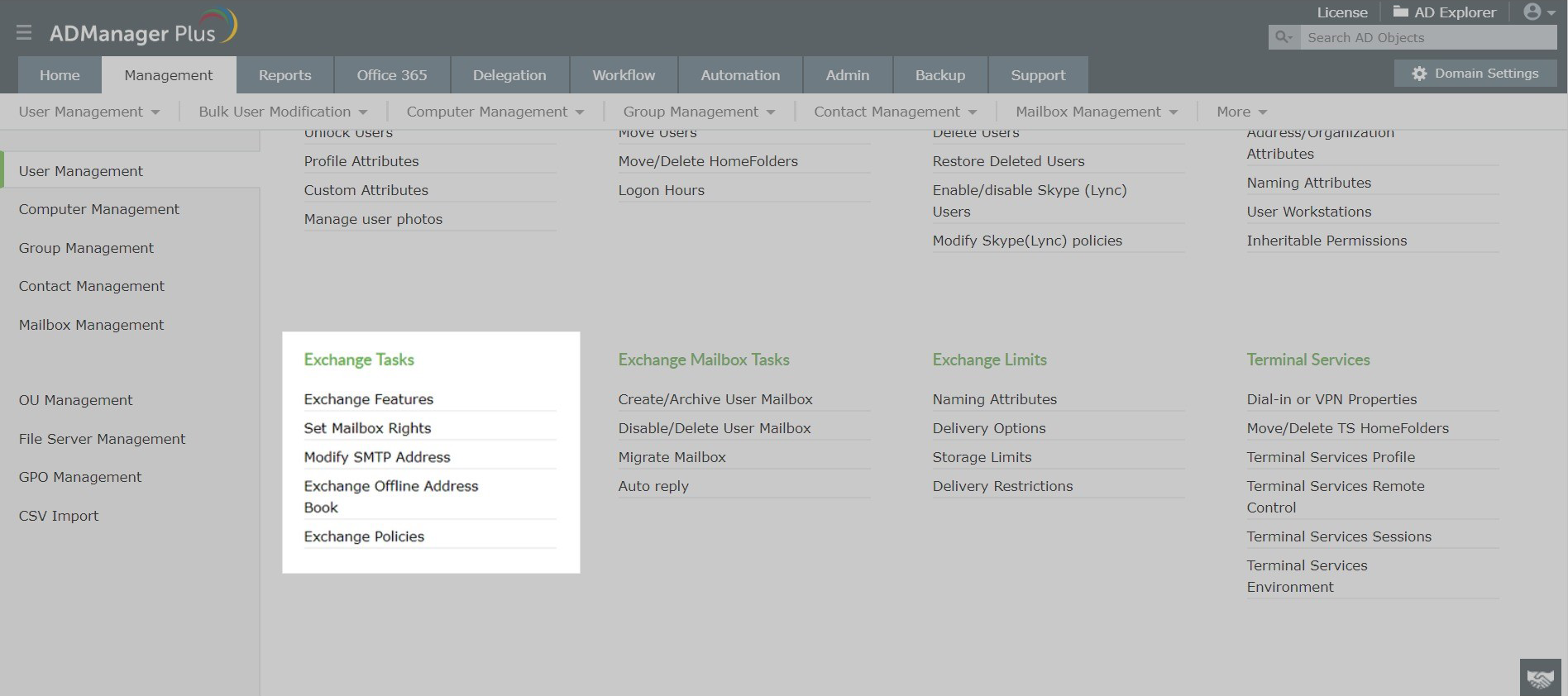 Oltre alle attività descritte in alto, questo strumento via web è anche dotato di funzionalità in grado di aiutarti a gestire le opzioni di consegna, le restrizioni di consegna e anche ad assegnare le rubriche offline di Exchange agli utenti. Oltre alla gestione di Exchange Server, questo strumento ti aiuta a gestire gli oggetti di Active Directory con facilità e tramite i modelli di attività predefiniti per le attività di gestione di Active Directory di routine e ripetitive.