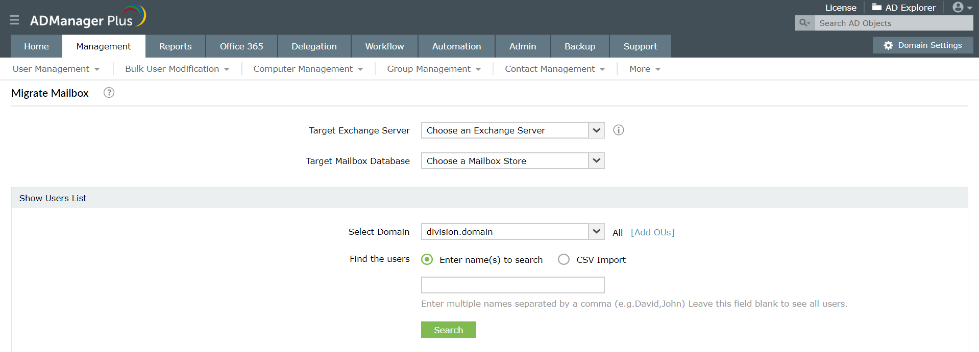 Migrazione delle cassette postali del Exchange: ADManager Plus trasforma la complessa attività di migrazione delle cassette postali di Exchange da una versione all'altra in una semplice attività basata su una semplice interfaccia utente grazie a questa funzionalità. Tutto ciò che devi fare è selezionare il server di Exchange di destinazione e la posizione o il database e indicare gli utenti di cui deve essere effettuata la migrazione delle cassette postali; le cassette postali indicate verranno spostate nella nuova versione di Exchange Server. La migrazione delle cassette postali di Exchange diventa davvero semplice.