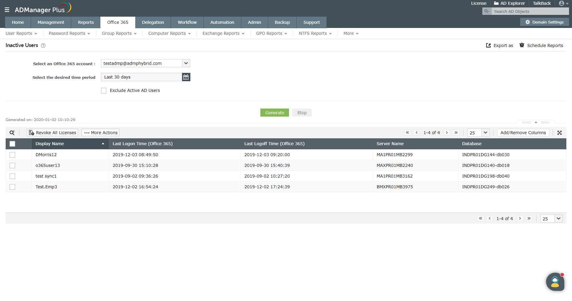 Gli amministratori possono generare un report su tutti gli utenti di Office 365 inattivi in un determinato dominio grazie a ADManager Plus. Possono anche effettuare operazioni di gestione tra cui assegnare o rimuovere le licenze degli utenti, nascondere gli utenti negli elenchi di indirizzi, configurare l'inoltro delle e-mail e le impostazioni dei limiti di archiviazione e aggiungere indirizzi e-mail addizionali per gli utenti direttamente dai report. Inoltre, gli amministratori possono visualizzare informazioni essenziali sugli utenti nel report, sulla generazione dei report di pianificazione ed escludere gli utenti AD attivi durante la generazione del report. Gli amministratori possono anche archiviare i report o inviarli tramite e-mail ad altri tecnici. Questo report può essere esportato come file CSV, PDF, HTML o XLS.