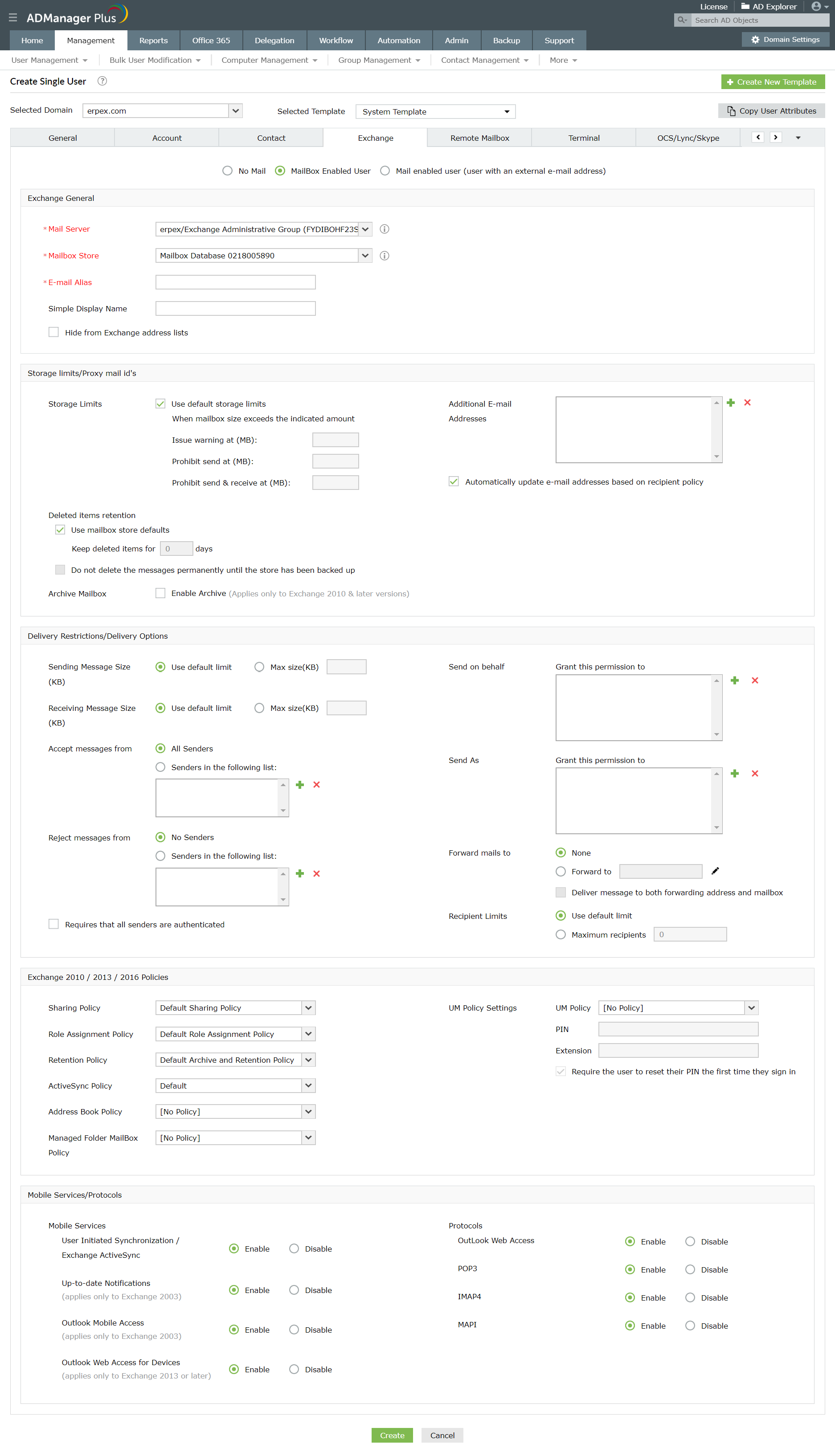 - Seleziona il modello di creazione utente appropriato, immetti i valori per tutti gli attributi di Active Directory e di Exchange Server richiesti e fai clic su Crea.