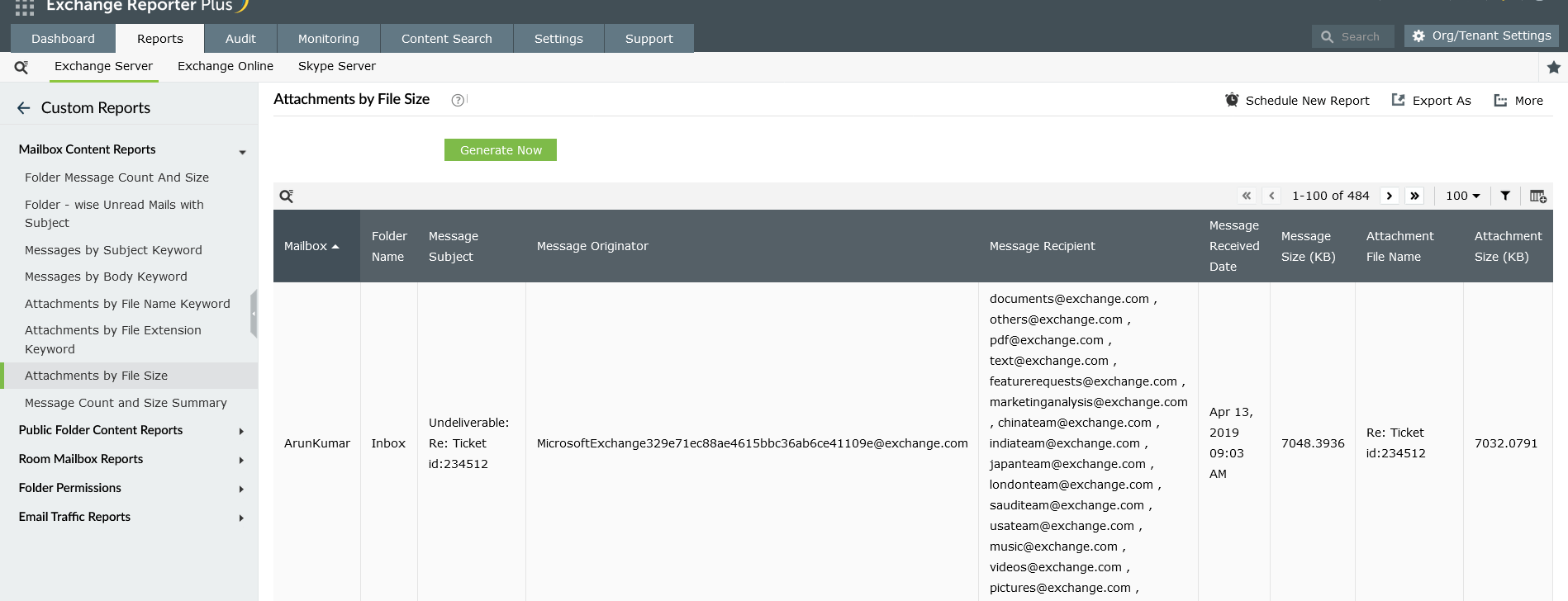 I report di Exchange Reporter Plus forniscono anche dettagli sulla data di ricezione di un allegato. Qualsiasi allegato dubbio può essere facilmente identificato esaminando questi report.